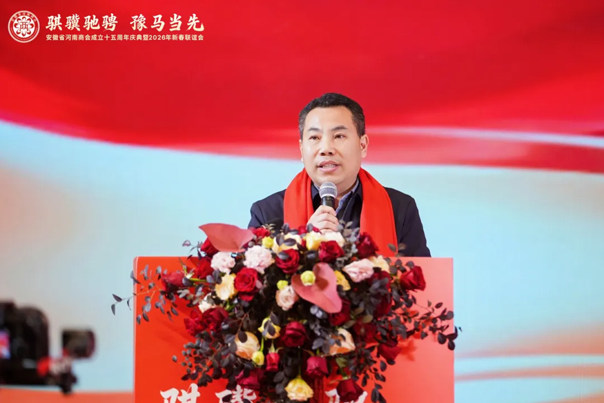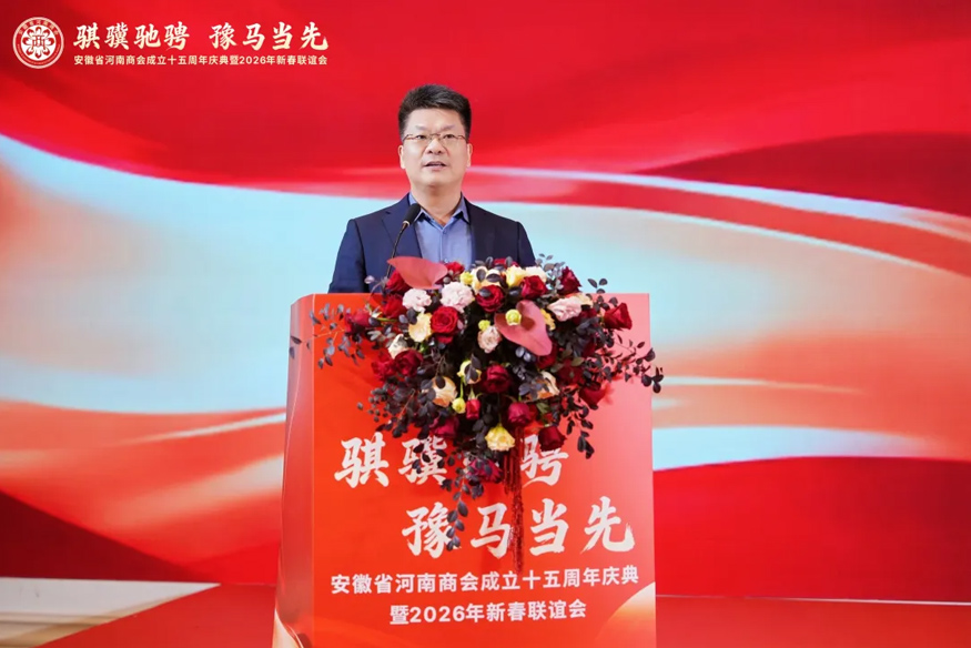 骐骥驰骋,豫马当先。元月25日下午,安徽省河南商会成立十五周年庆典暨2026年新春联谊会在合肥白金汉爵大酒店隆重举行。安徽省食品药品监督管理局原一级巡视员李长在,安徽省合作交流办公室副主任陈龙,安徽省社会组织总会会长、安徽省审计厅原一级巡视员贾宝明,安徽省工商联三级调研员宋翠琳,安徽省退役军人事务厅原一级巡视员梅德林,安徽省边防总队原政委袁同海,一〇五医院原副院长赵连才,安徽省国土资源厅原纪检组长江献军,安徽省委人事厅原编委办主任赵振英,安徽省经信厅原老干部局局长展岩,安徽省煤炭设计院原院长闫红新,安徽省卫生管理学院原副院长赵国子,安徽省委政法委原扫黑办副主任张剑锋,安徽省委党校原二级巡视员张金友等与驻马店市商务局副局长柳晓刚、市工商联副主席张永红等家乡领导出席盛会。在皖兄弟商会、省级异地商会及友好商协会、全体会员及社会各界朋友500余人齐聚一堂,共叙乡梓情谊,共话发展新篇。