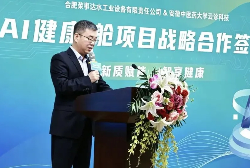 支新郁总裁发表致辞,对各方嘉宾的到来表示热烈欢迎。他表示,荣事达水工业深耕净水与智慧健康领域近二十载,始终以“健康水 中国梦”为初心,此次与安徽中医药大学云诊科技的携手,是企业向“净水+健康”双赛道升级的重要一步。他期待以此次签约为起点,发挥各自优势,共同推动AI健康舱项目落地开花,为社区居民带来更便捷、专业的健康服务。