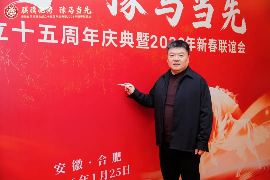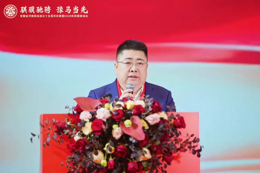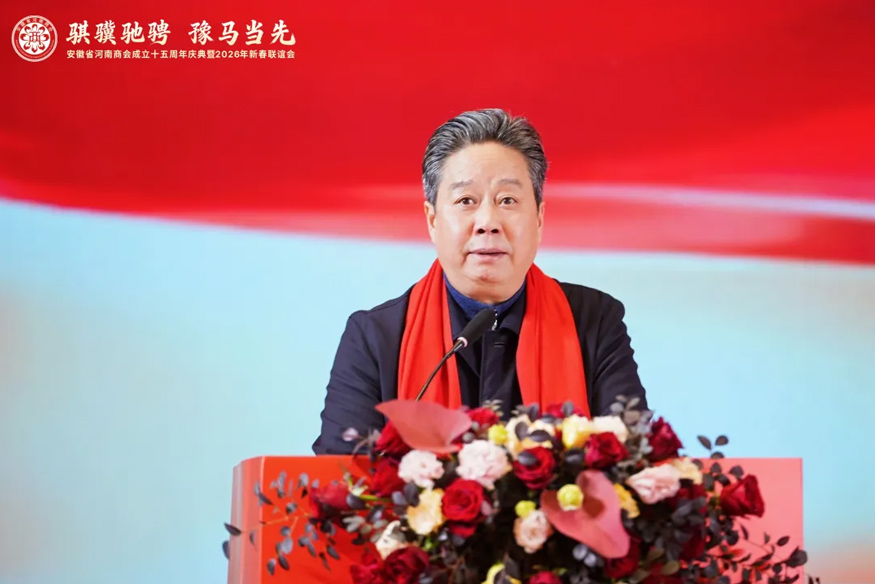 骐骥驰骋,豫马当先。元月25日下午,安徽省河南商会成立十五周年庆典暨2026年新春联谊会在合肥白金汉爵大酒店隆重举行。安徽省食品药品监督管理局原一级巡视员李长在,安徽省合作交流办公室副主任陈龙,安徽省社会组织总会会长、安徽省审计厅原一级巡视员贾宝明,安徽省工商联三级调研员宋翠琳,安徽省退役军人事务厅原一级巡视员梅德林,安徽省边防总队原政委袁同海,一〇五医院原副院长赵连才,安徽省国土资源厅原纪检组长江献军,安徽省委人事厅原编委办主任赵振英,安徽省经信厅原老干部局局长展岩,安徽省煤炭设计院原院长闫红新,安徽省卫生管理学院原副院长赵国子,安徽省委政法委原扫黑办副主任张剑锋,安徽省委党校原二级巡视员张金友等与驻马店市商务局副局长柳晓刚、市工商联副主席张永红等家乡领导出席盛会。在皖兄弟商会、省级异地商会及友好商协会、全体会员及社会各界朋友500余人齐聚一堂,共叙乡梓情谊,共话发展新篇。