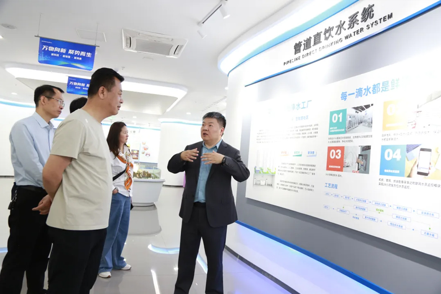 领导一行全面考察公司在全屋智慧净水、管道直饮水、校园智慧饮水、单位/工厂直饮水等领域的全场景布局与技术成果。重点考察管道直饮水项目:该项目针对社区、学校、医院、企事业单位及工厂等多元场景,提供定制化饮水解决方案,涵盖社区智慧水站、校园智慧净水屋、管道直饮水入户/入栋模式,以“一站式”服务为民众打造便捷、高端、健康的饮水体验,同时在应急保障场景中具备突出优势。